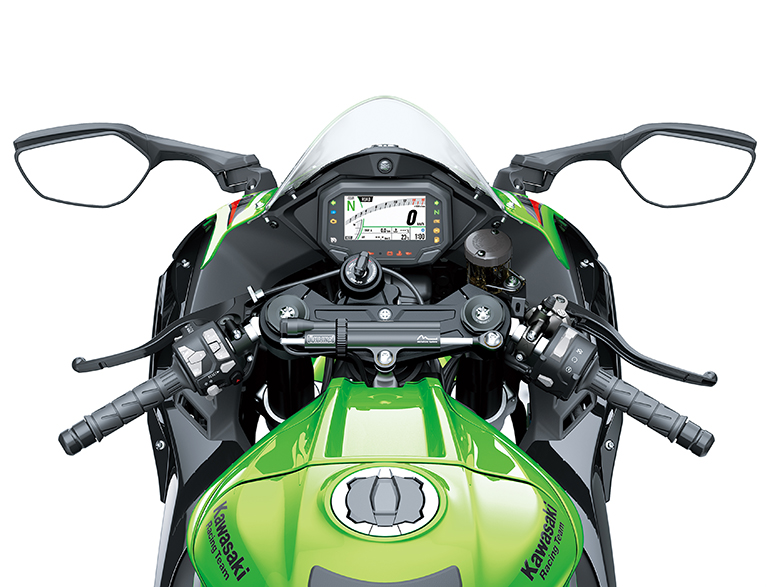 Dietro al cupolino è stato introdotto un display TFT racing (con connettività Bluetooth). Permette di scegliere fra quattro riding modes selezionabili tramite pulsanti del semi-manubrio. E per rendere più confortevole l’utilizzo in strada della moto, sono stati introdotti il cruise control e le manopole riscaldate (presenti nella lista accessori originali Kawasaki).