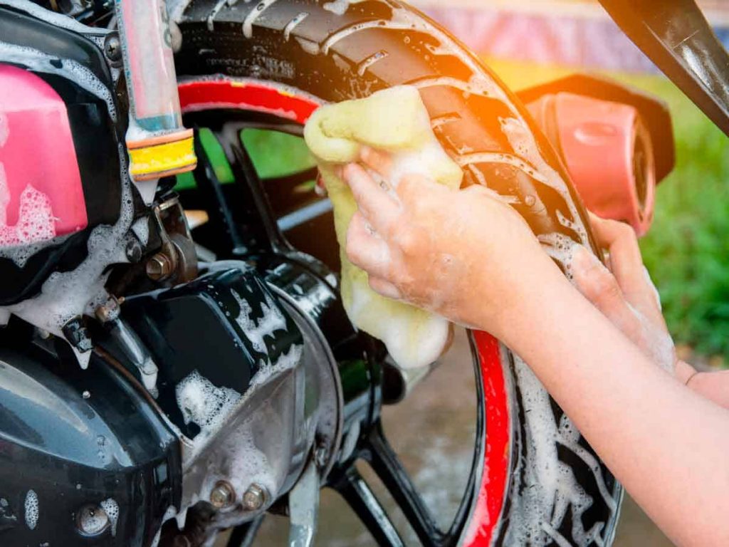 Se hai messo del grasso antiruggine su alcune parti della moto in previsione della lunga pausa, rimuovilo tutto per bene. Puoi utilizzare un panno in cotone e del detergente specifico oppure un poco di benzina.
